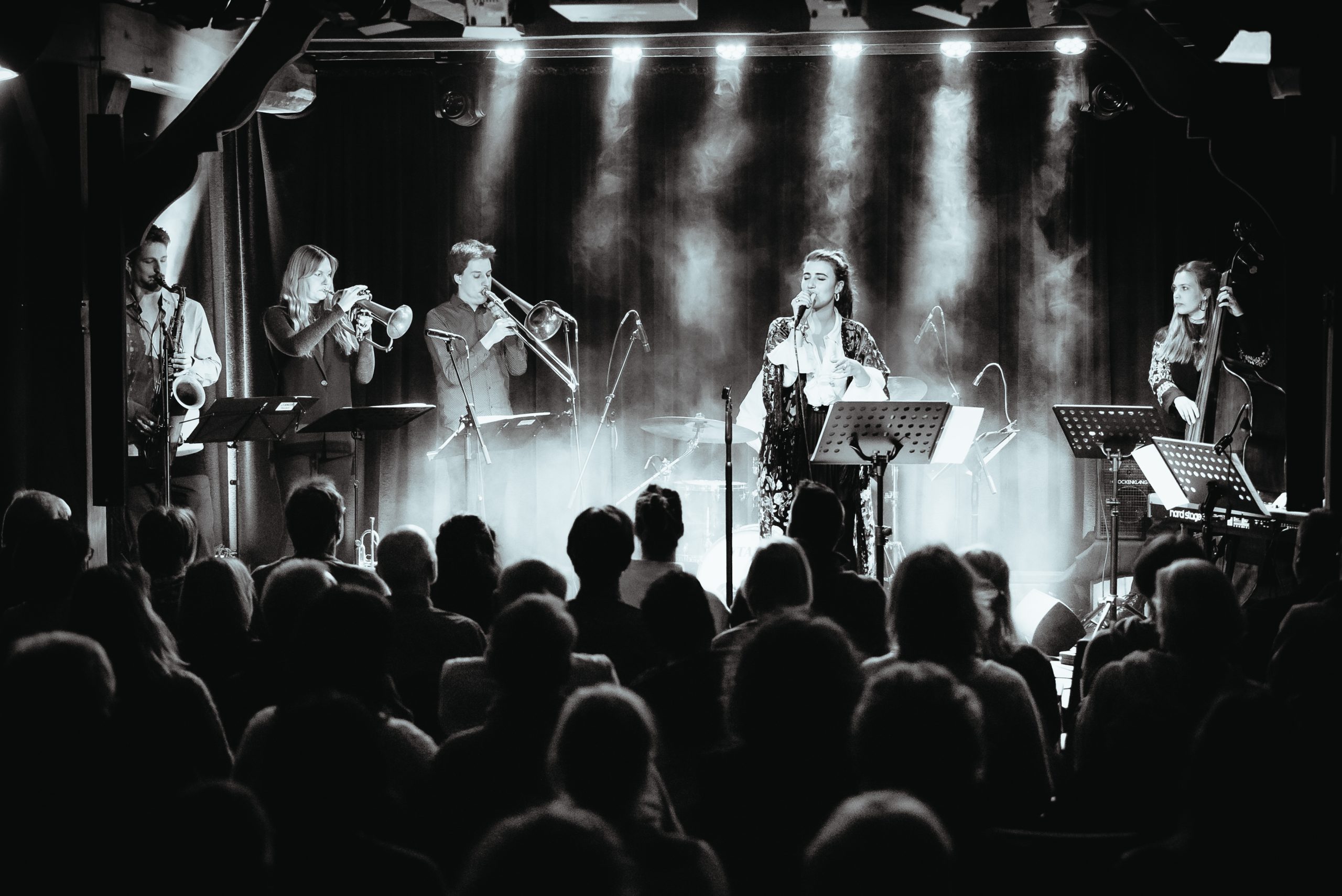 Live wird deutlich, dass es sich nicht um eine Sängerin mit Begleitmusikern, sondern um ein echtes, organisch gewachsenes Kollektiv handelt. Die sieben Musiker:innen, die sich im Musikstudium und Bundesjazzorchester fanden, geben sich gegenseitig Raum und erschaffen einen breiten, dynamischen Bandsound, der mühelos zwischen pulsierender Energie und intimen, narrativen Momenten wechselt.